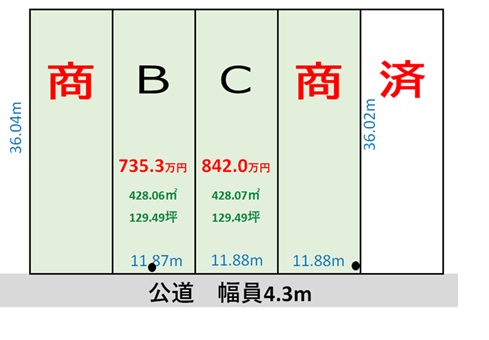 | 備考 | 建築の際は、農地転用許可・建築許可等の申請が必要です。 建築残り2区画 |
