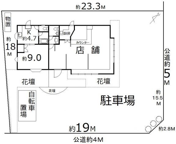 | 土地面積 | 389㎡(約117.67坪) | 建物面積 | 店舗:約55.75㎡ 居宅:約28.35㎡ 計:84.11㎡ |